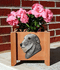 Materials: Pine sides and legs with perforated PVC plastic bottom. Finished with an outdoor stain/sealer. Weather resistant. Single hand-painted 2-dimensional breed head included. Holds up to 4 heads. Suitable for indoor or outdoor display. Overall dimensions: 9-1/8" x 9-1/8" x 8". Inside dimensions: 6-3/4" square. Flower not included.